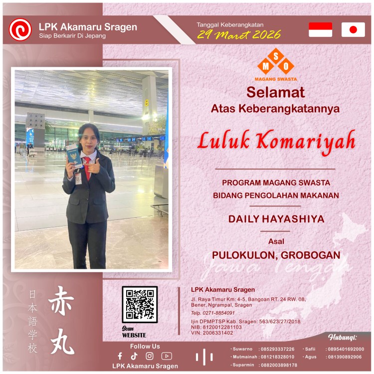 - Melatih kedisiplinan dan etos kerja sesuai standard di Jepang.